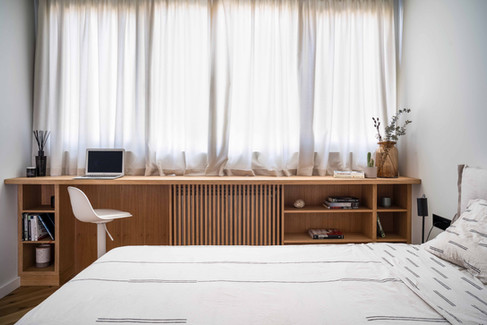This design was created with the needs of a couple in mind - two people who are avid travelers, sports enthusiasts, and also work from home. To provide them with ample storage and workspace, most of the furniture in the room was custom-made according to our design. Every inch of space was used to optimize the functionality and aesthetic appeal of the room.